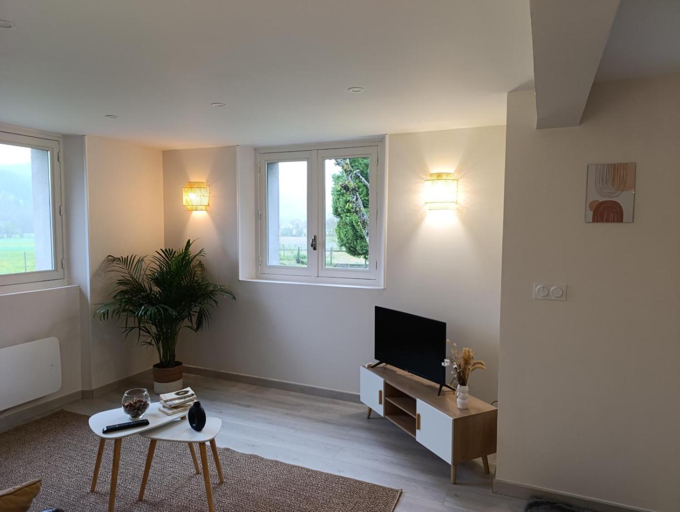Appartement 1 Chambre. The fireplace is the standout feature of this apartment. In the well-equipped kitchen, guests will find a stovetop, a refrigerator, a dishwasher and kitchenware. The apartment has parquet floors, a seating area with a flat-screen TV, a washing machine, a private entrance as well as garden views. The unit has 1 bed.