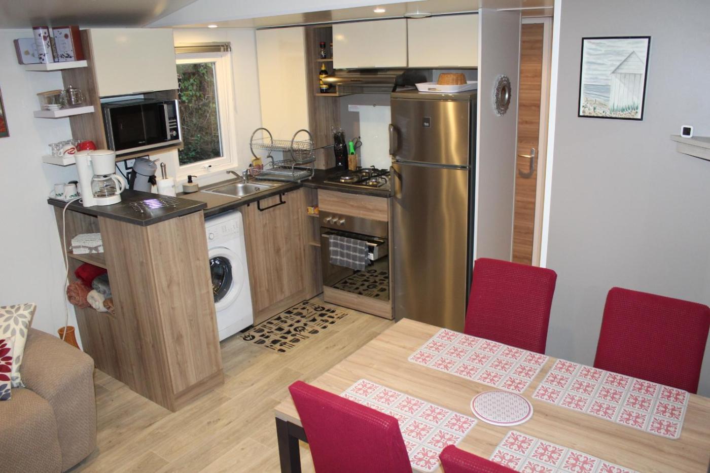 Mobile Home. This mobile home consists of 3 bedrooms, kitchen, a terrace and 2 bathrooms with a shower. Guests will find kitchenware, an oven, a microwave and a toaster in the well-equipped kitchen. The mobile home also offers a barbecue. This mobile home features a washing machine, a coffee machine, a TV and a patio. The unit offers 5 beds.