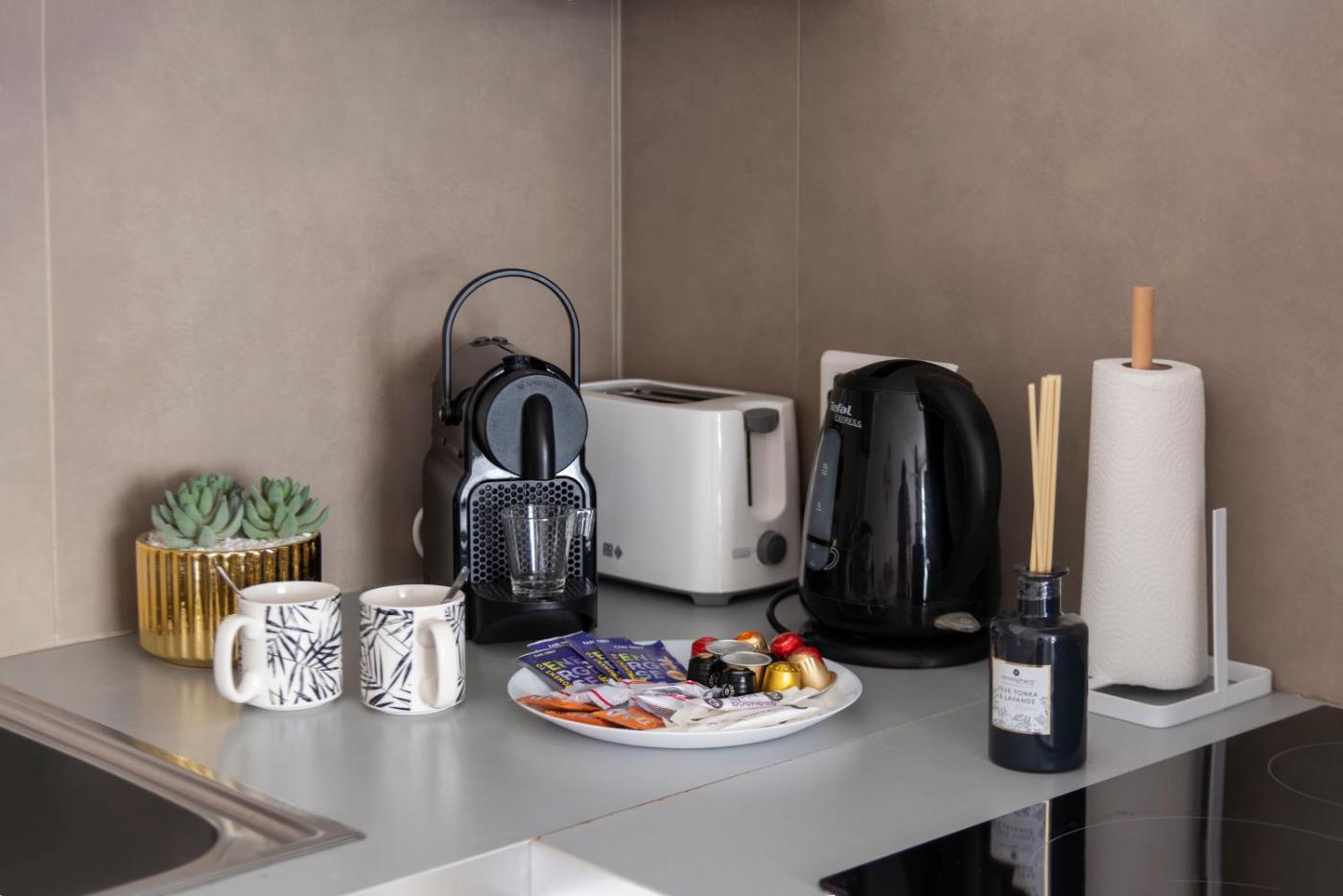 Studio Lit Queen-Size de Luxe. The studio has a private bathroom fitted with a shower and a hairdryer. Meals can be prepared in the kitchen, which has a refrigerator, an oven, a microwave and a toaster. The air-conditioned studio features a flat-screen TV with satellite channels, a washing machine, a coffee machine, a wardrobe as well as city views. The unit has 1 bed.