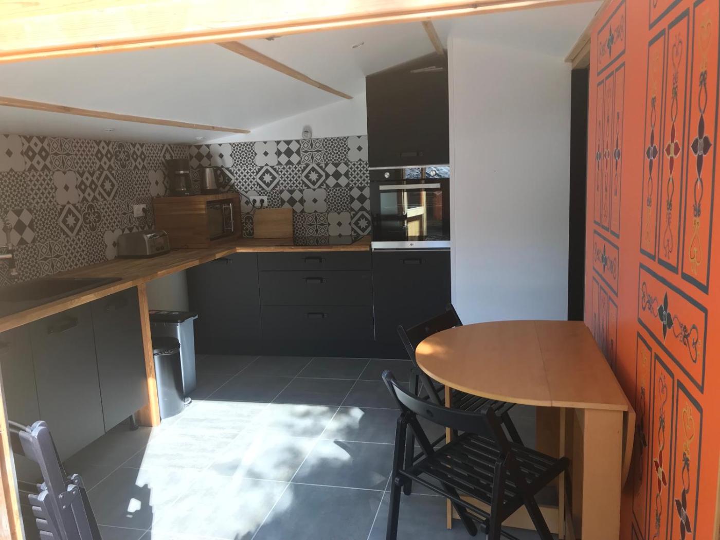 La cuisine est pourvue d’un réfrigérateur, d’un four et d’un micro-ondes. Elle est également dotée d’une machine à café et d’une bouilloire.