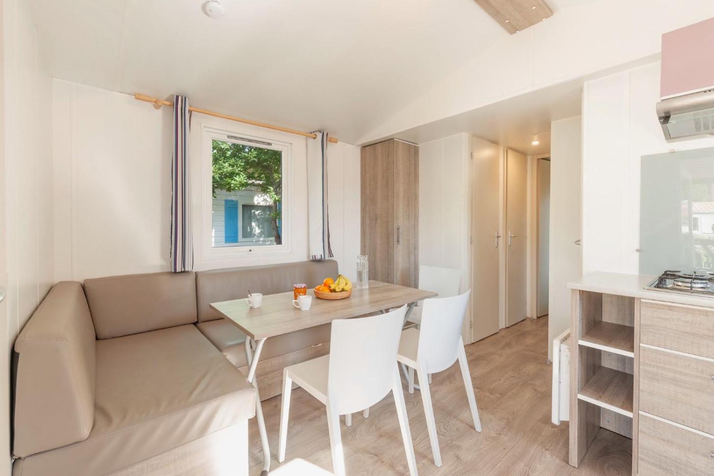 Mobile Home. This air-conditioned mobile home includes 1 living room, 2 separate bedrooms and 1 bathroom with a shower. Guests can make meals in the kitchenette that has a stovetop, a refrigerator and a microwave. This mobile home has a dining area, heating, a TV and a terrace. The unit has 3 beds. ;