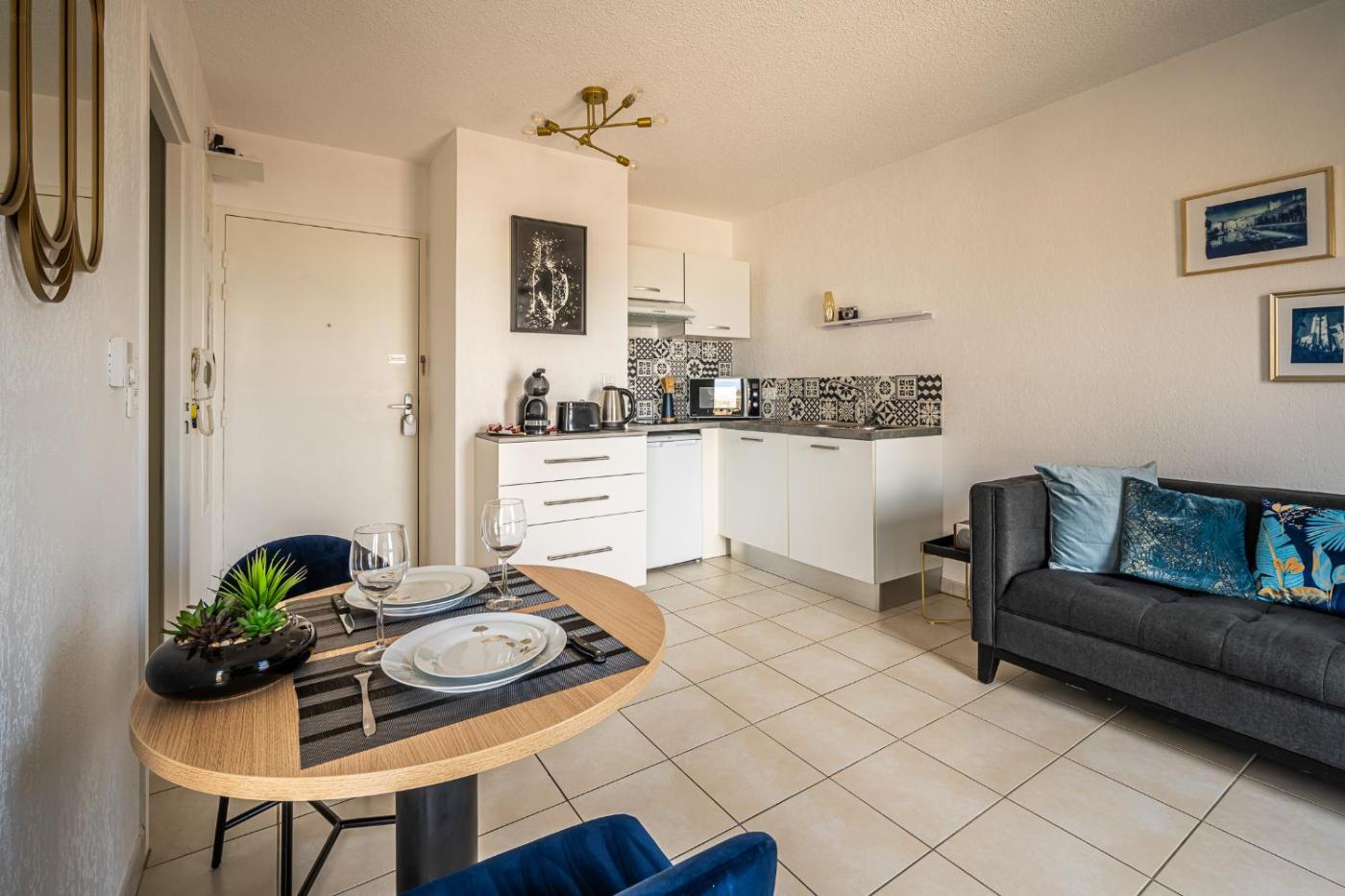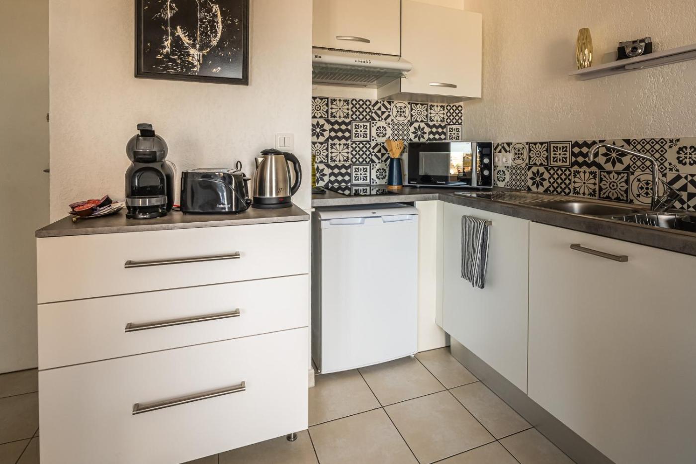 Appartement 1 Chambre. Featuring a private entrance, this air-conditioned apartment comprises 1 living room, 1 separate bedroom and 1 bathroom with a shower and a hairdryer. In the kitchen, guests will find a stovetop, a refrigerator, kitchenware and a microwave. Boasting a terrace with city views, this apartment also provides a washing machine and a flat-screen TV. The unit offers 1 bed.