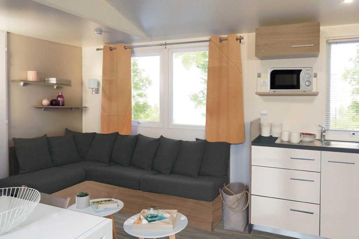 Mobile Home 2 Chambres. Boasting 2 bedrooms and 1 bathroom with a shower, this mobile home has a well-fitted kitchen and a terrace. The mobile homes kitchen, which has kitchenware, is available for cooking and storing food. This mobile home features a private entrance and a TV. The unit offers 3 beds. ;