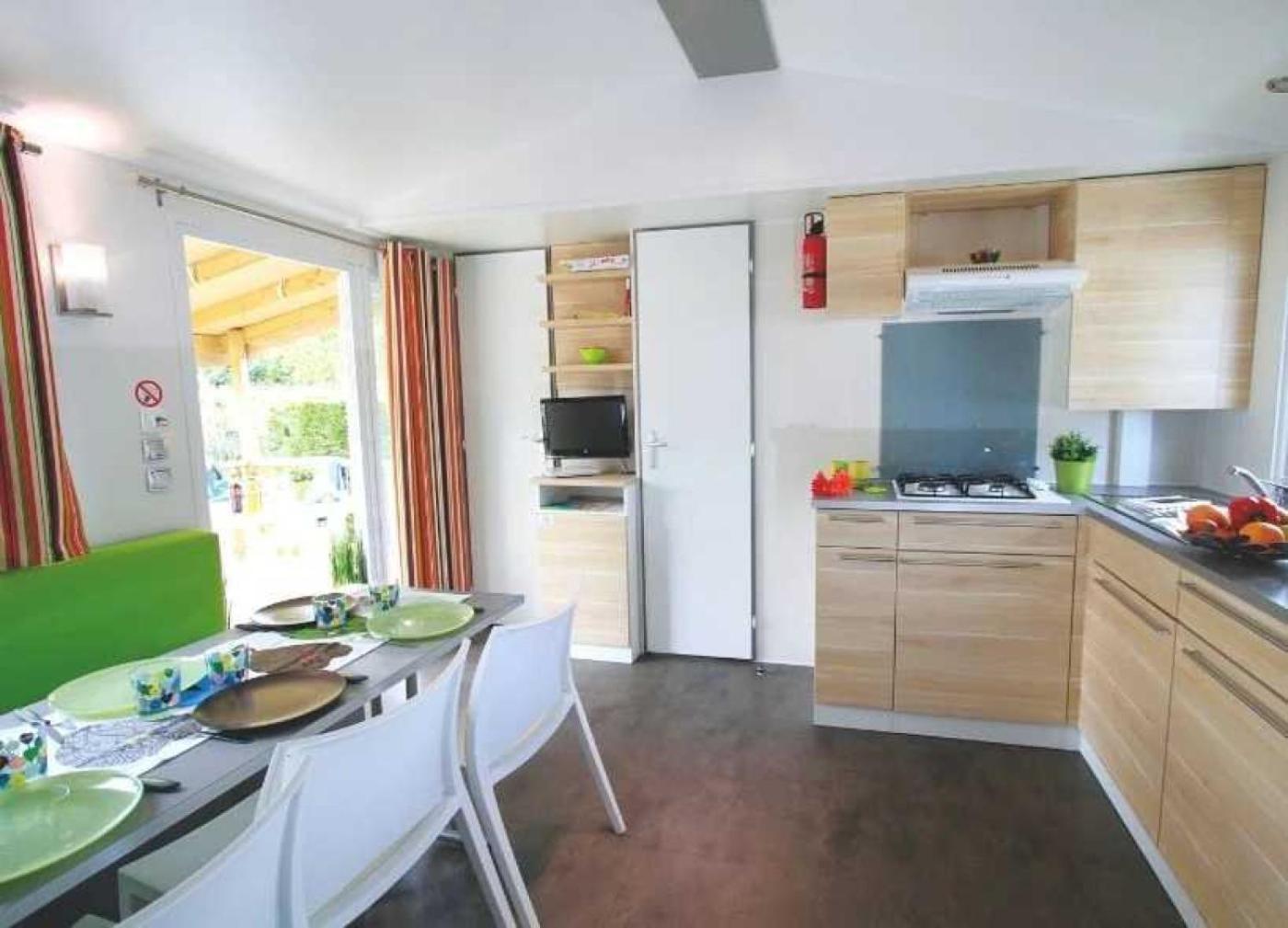 Mobile Home 3 Chambres. Boasting a private entrance, this mobile home also includes 1 living room, 3 separate bedrooms and 1 bathroom with a shower. In the well-equipped kitchen, guests will find a stovetop, a refrigerator, a dishwasher and kitchenware. This mobile home offers a TV. The unit has 6 beds. ;