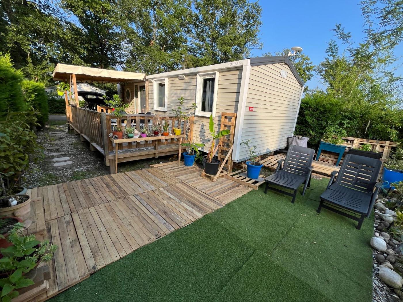 Mobile Home. The air-conditioned mobile home has 2 bedrooms and 1 bathroom with a shower and a hairdryer. This mobile home features a tea and coffee maker, a seating area, a flat-screen TV and an outdoor dining area. The unit has 3 beds.