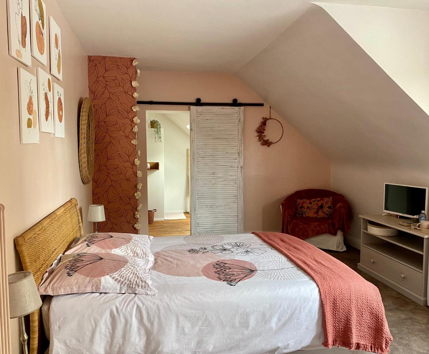 Chambre Double avec Salle de Bains Privative. The double room offers air conditioning, a tea and coffee maker, as well as a private bathroom boasting a walk-in shower and a hairdryer. The double room provides a wardrobe, a dressing room, a carpeted floor, a flat-screen TV, as well as ancourtyard view. The unit has 1 bed. ;