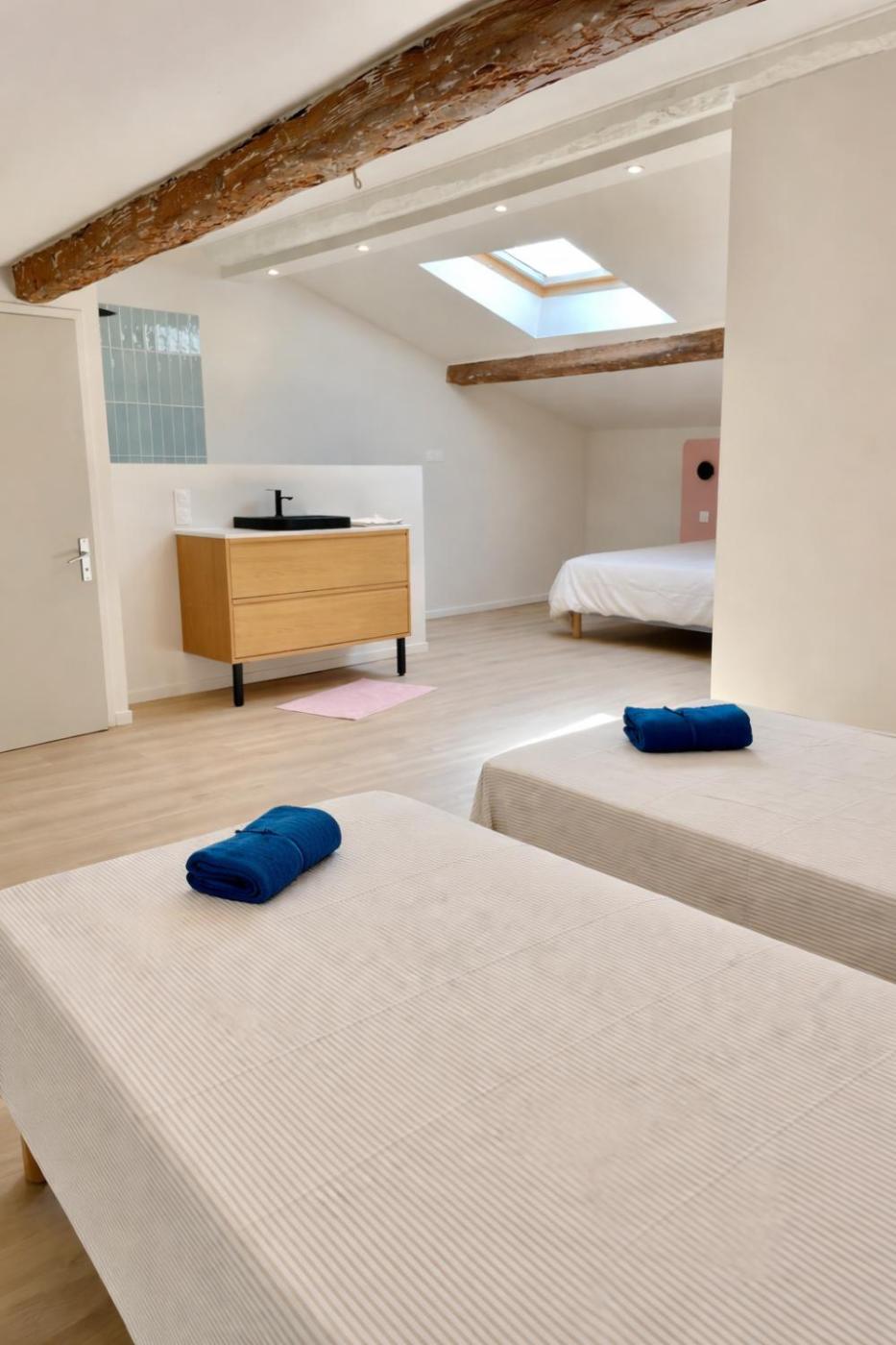Chambre Quadruple. The quadruple room provides a private entrance, a wardrobe, as well as a private bathroom featuring a walk-in shower and a hairdryer. The unit offers 2 beds. ;
